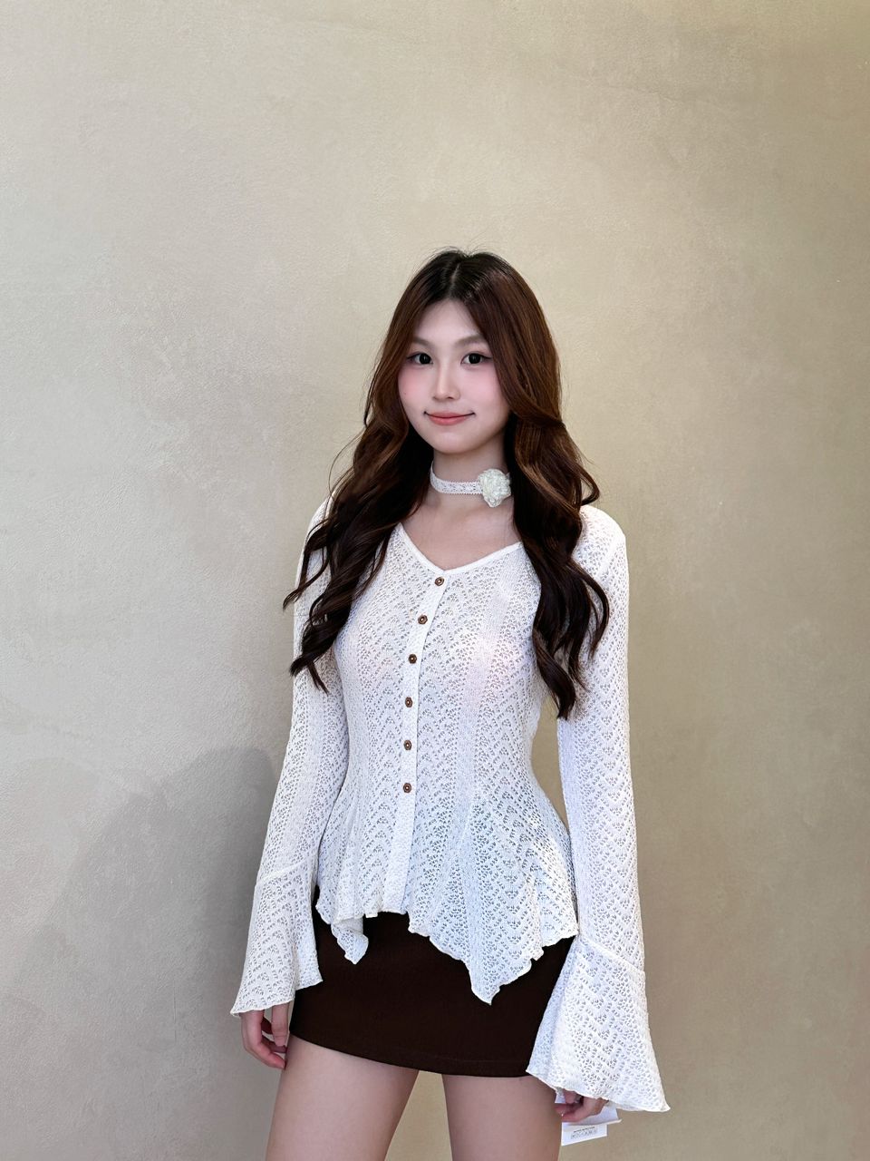 飘带喇叭袖针织上衣