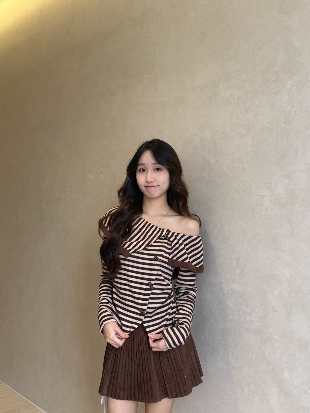 一字肩条纹荷叶领上衣