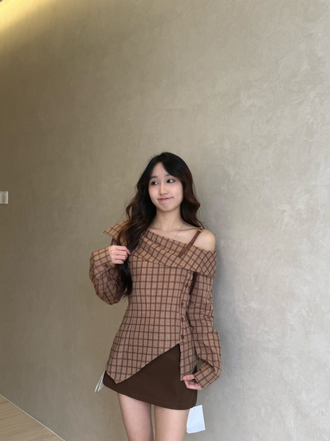 复古格纹斜肩衬衫